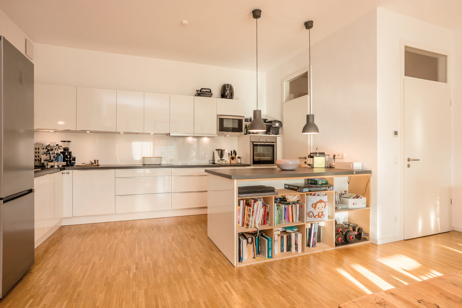 Vom großzügigen Wohn- und Essbereich mit moderner Einbauküche gelangen Sie auf den nach Süden ausgerichteten, großen Balkon, von dem aus Sie einen wunderbaren Blick in den weitläufigen, begrünten Innenhof der Anlage genießen.