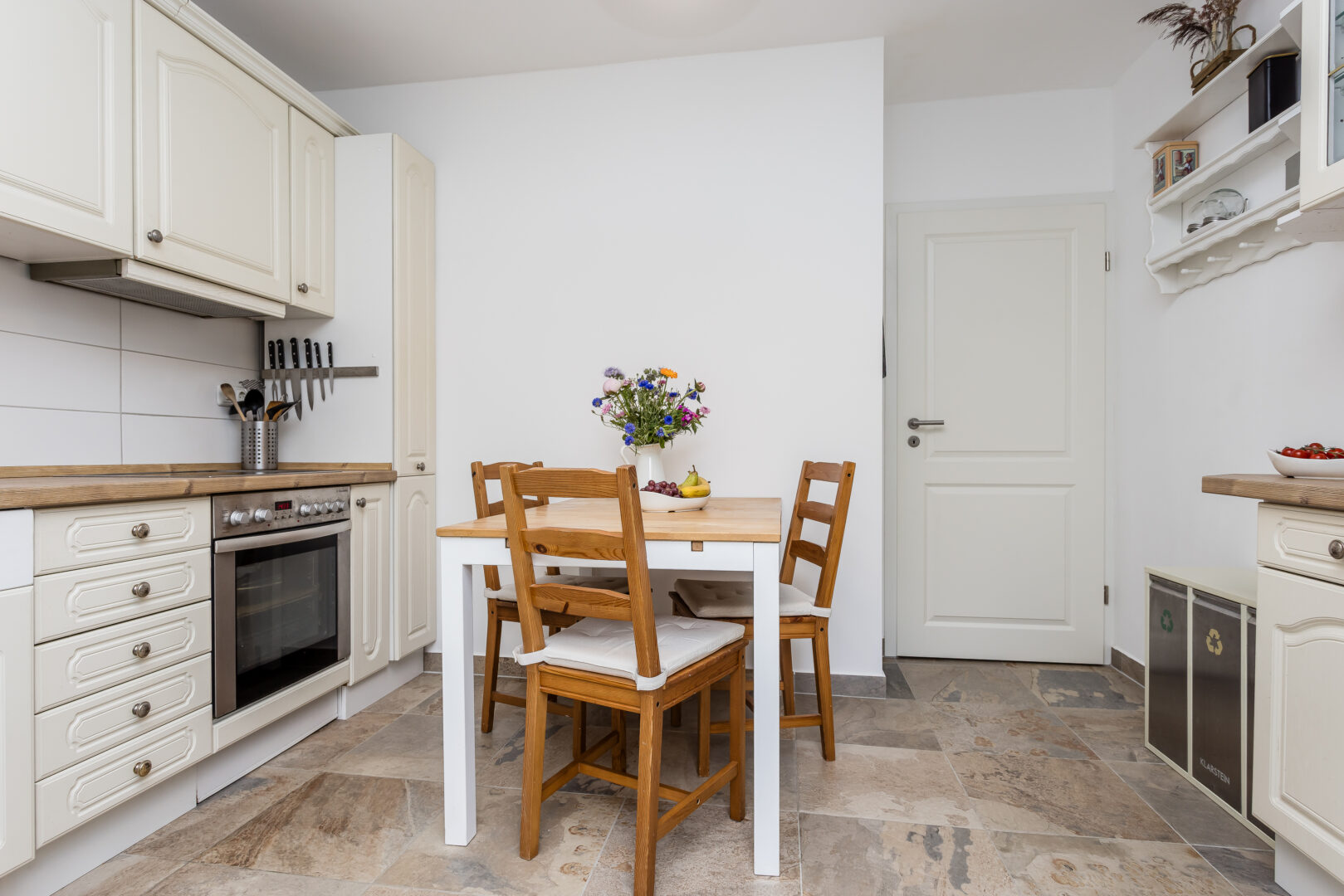 Das moderne, tagesbelichtete Badezimmer ist mit einer Badewanne, einer separaten Dusche, einem Waschbecken, einem WC ausgestattet. Die großzügige Küche ist mit einer Einbauküche im Landhausstil inklusive Einbaugeräten ausgestattet und bietet reichlich Platz für einen großen Essbereich. Von der Küche aus gelangen Sie direkt in den idyllisch angelegten Garten, in dem Sie entspannen die Seele baumeln lassen können.
