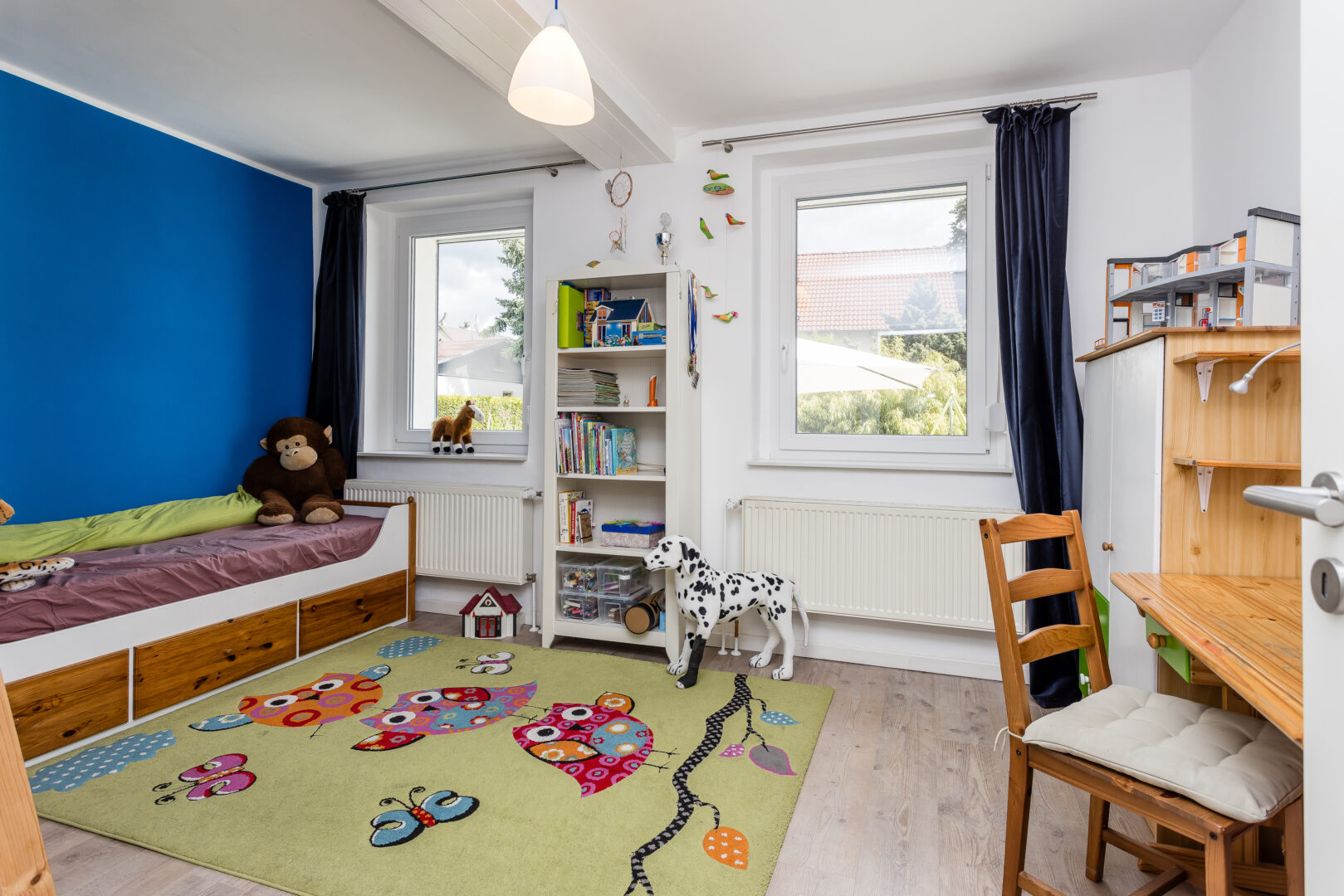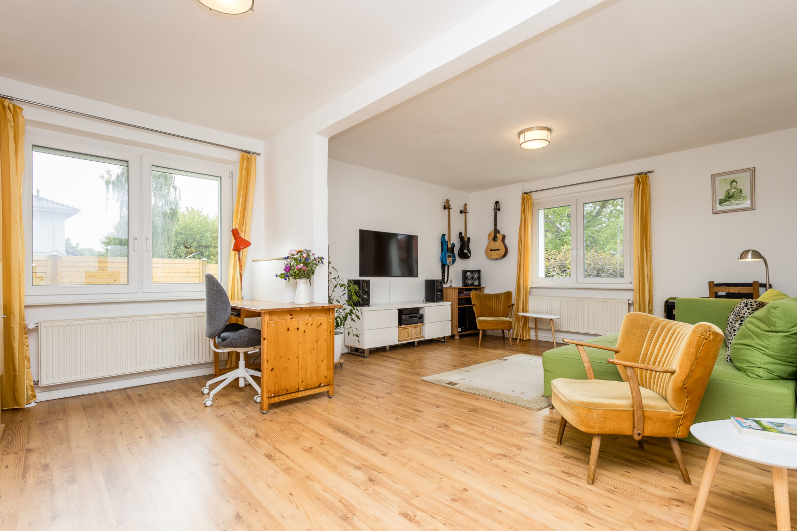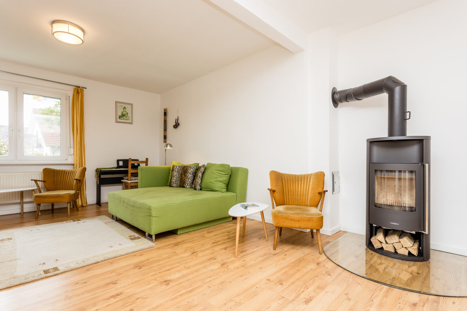 Neben zwei vielseitig nutzbaren Räumen, die als Schlaf-, Kinder- oder Arbeitszimmer genutzt werden können, bietet das großzügige, lichtdurchflutete Wohnzimmer ebenfalls viel Raum für Gestaltung. Besonders in den Wintermonaten verleiht ein im Jahr 2022 neu installierter Kaminofen diesem Raum eine behagliche Wärme. Das Wohnzimmer bietet ausreichend Platz, um auch hier einen großzügigen Essbereich einzurichten.