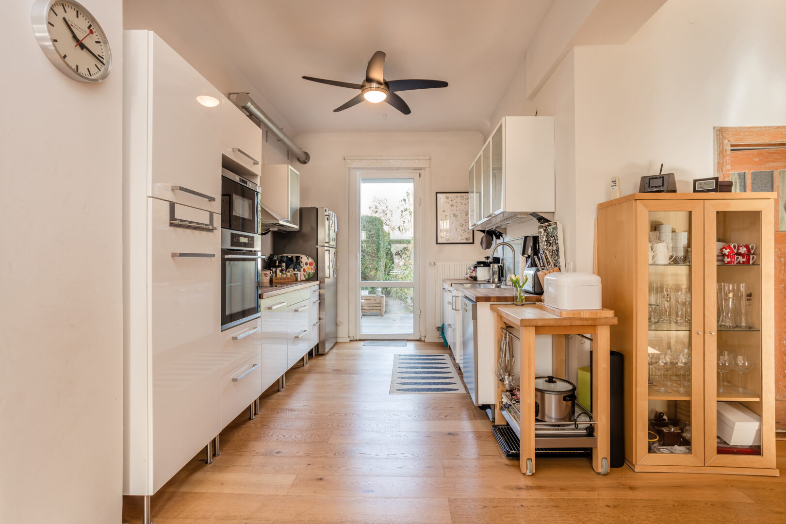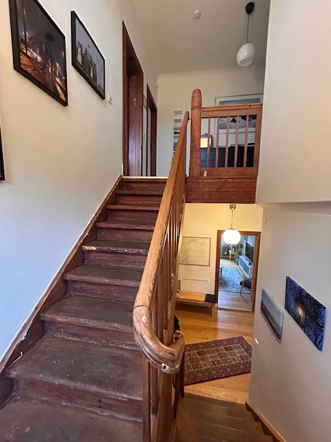 Der großzügige Hauptflur führt sternförmig in alle Räume des Erdgeschosses. Eine imposante Altbautreppe aus der Entstehungszeit des Hauses verbindet das Erdgeschoss mit dem Obergeschoss. Geradeaus liegt die offene Küche, die mit dem gegenüberliegenden Essbereich verbunden wurde. Von der Küche aus gelangt man direkt auf die Terrasse und in den nach Westen ausgerichteten Garten.