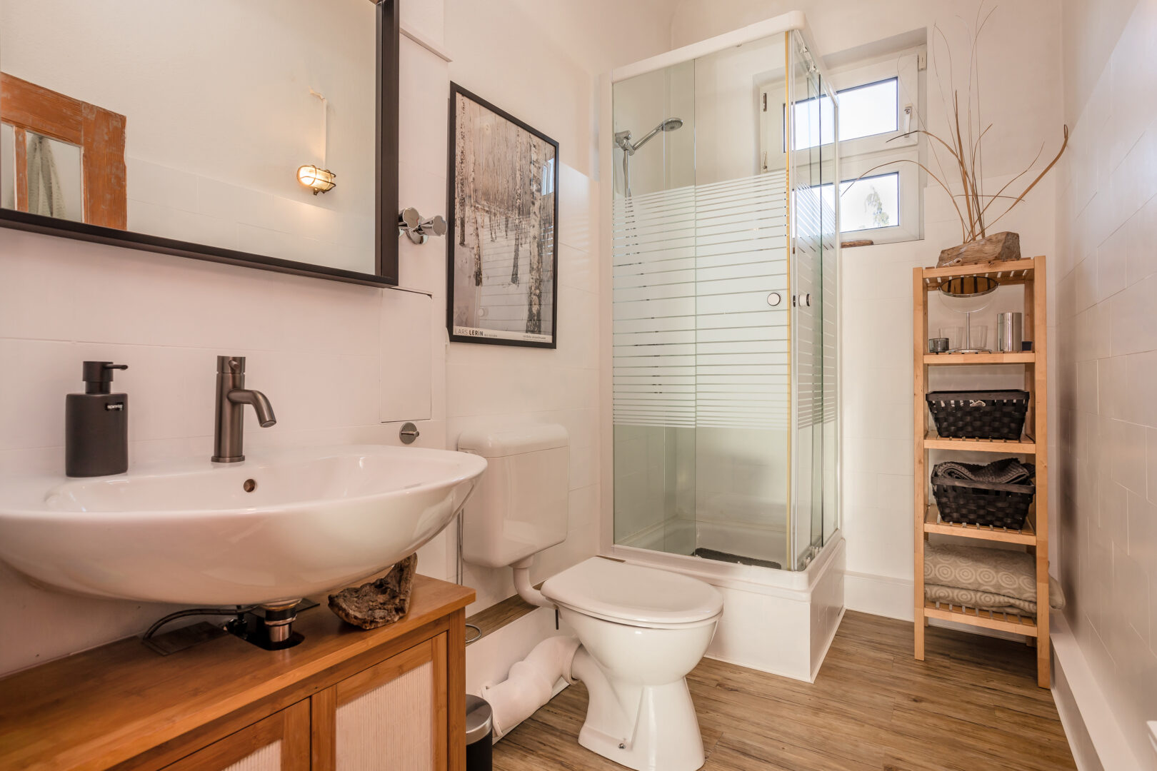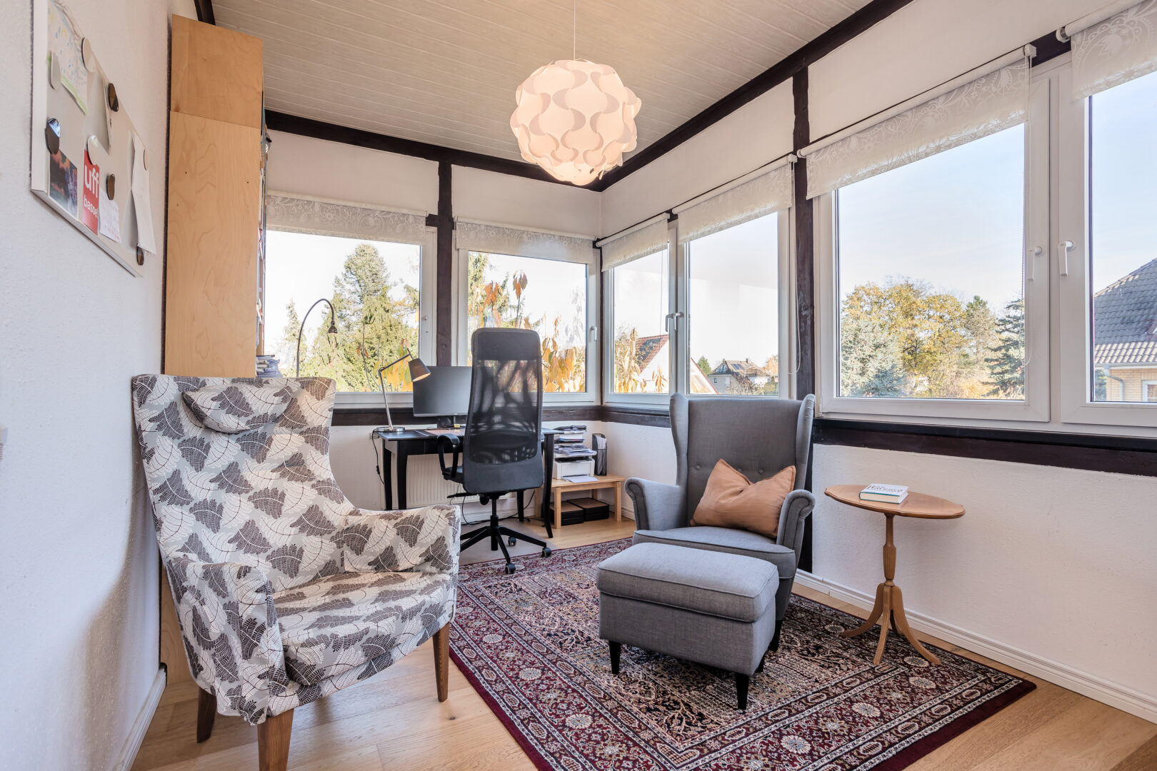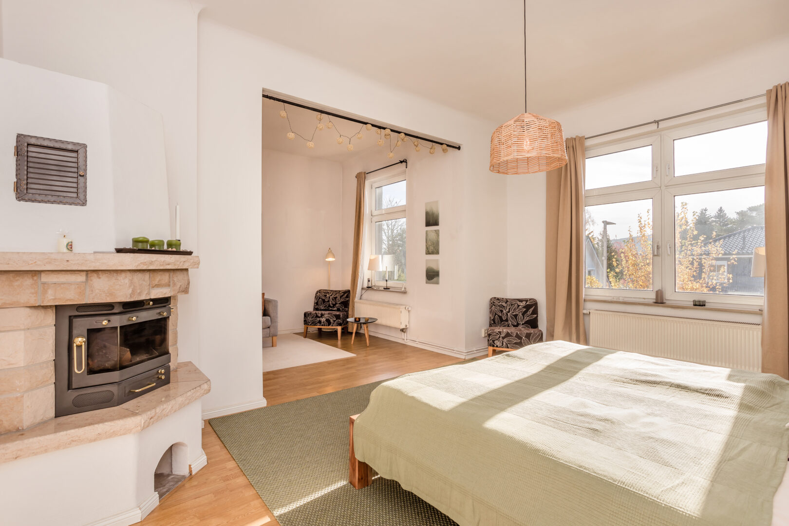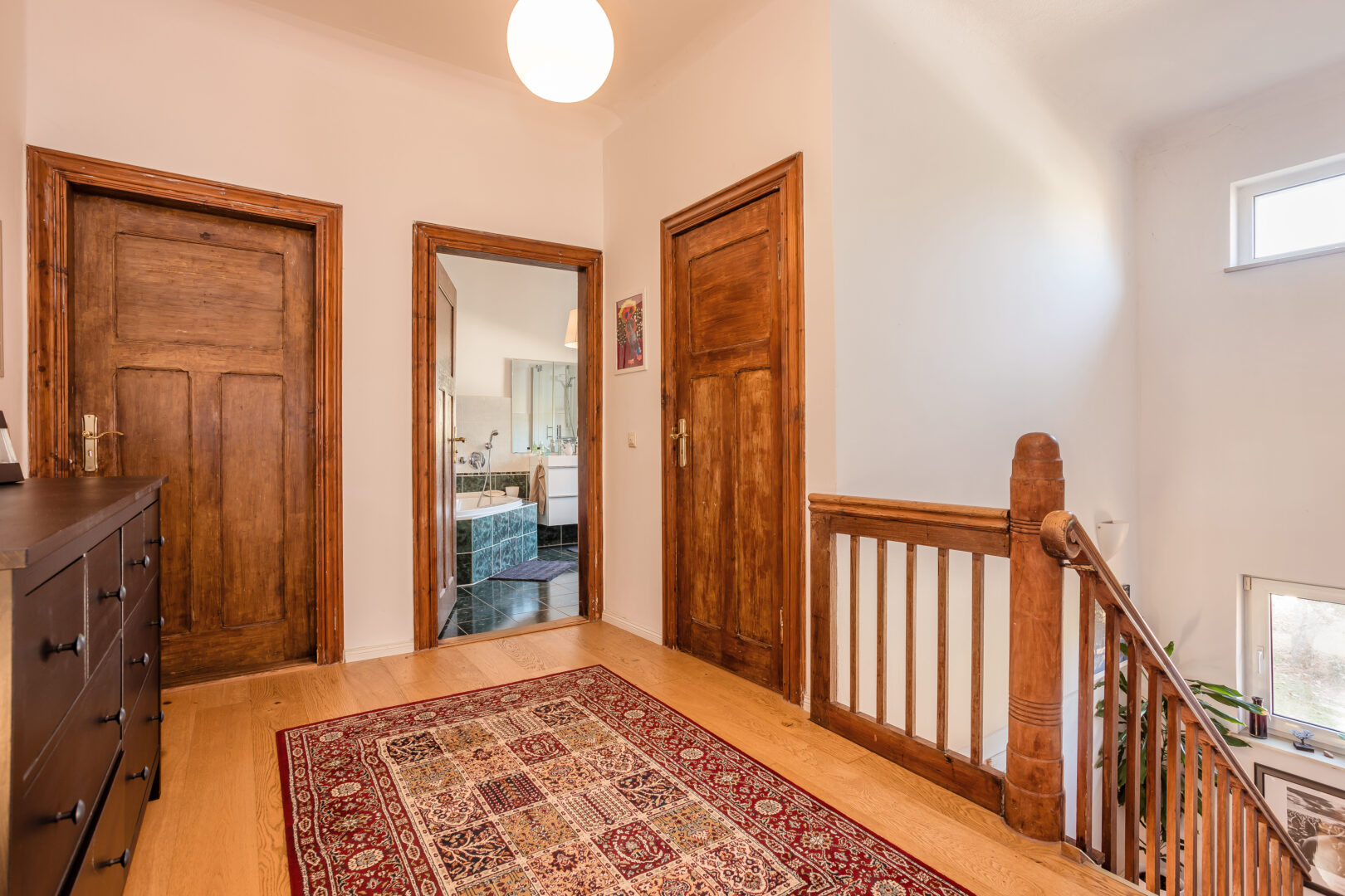 Das Treppenhaus zum Obergeschoss wird durch ein Fenster und ein Oberlicht angenehm beleuchtet. Hier sind ebenfalls alle Räume über den Flur erreichbar. Gleich zu Beginn liegt ein kleiner Atelierraum ebenfalls im Fachwerkstil, der sich ideal als Arbeitszimmer eignet. Das Schlafzimmer verfügt über einen geräumigen Vorraum und einen Kaminanschluss. Gegenüberliegend befindet sich ein weiteres geräumiges Schlafzimmer und das große, moderne Masterbad mit Dusche, einer großen Eckbadewanne und Doppelwaschbecken. Ein zusätzlicher Abstellraum mit Fenster bietet weiteren Stauraum.