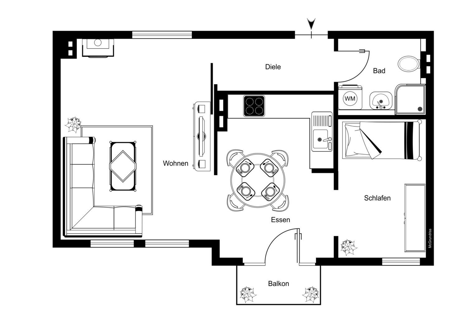 Beim Betreten der Wohnung gelangt man über einen großzügigen Eingangsbereich in den rechts gelegenen, durch eine Schiebetür getrennten offenen Wohn- und Küchenbereich. Der Wohnraum ist durch große, bodentiefe Fenster lichtdurchflutet und bildet das Herzstück der Wohnung. Die Küche wurde auf raffinierte Weise in den Wohnbereich integriert. Dabei wurde eine sogenannte mittlere Loft-Wand verwendet. Diese Wand trennt die Küche optisch vom Wohnbereich und kann gleichzeitig als Mediawand dienen. Der Küche ist ein nach Süden ausgerichteter Balkon angeschlossen. Das Schlafzimmer liegt gleich neben dem Wohn/-Küchenbereich.