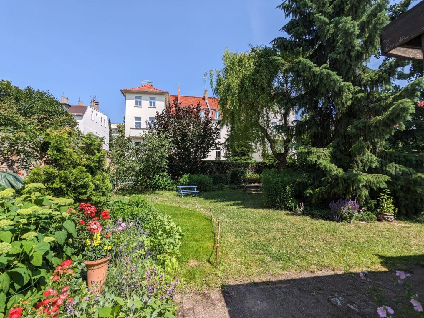 Vom Flur aus links gelegen befindet sich das geflieste Duschbad. Zur Wohneinheit gehören ein Kellerabteil und ein gepflegter, großzügiger Gartenbereich, der gemeinschaftlich genutzt werden kann.