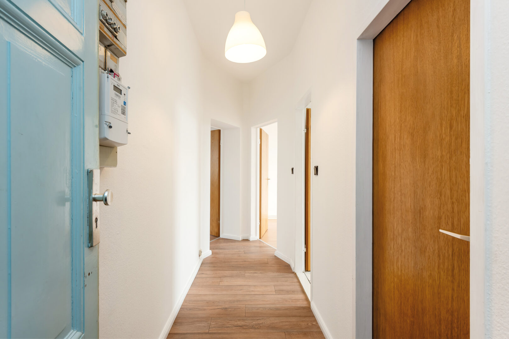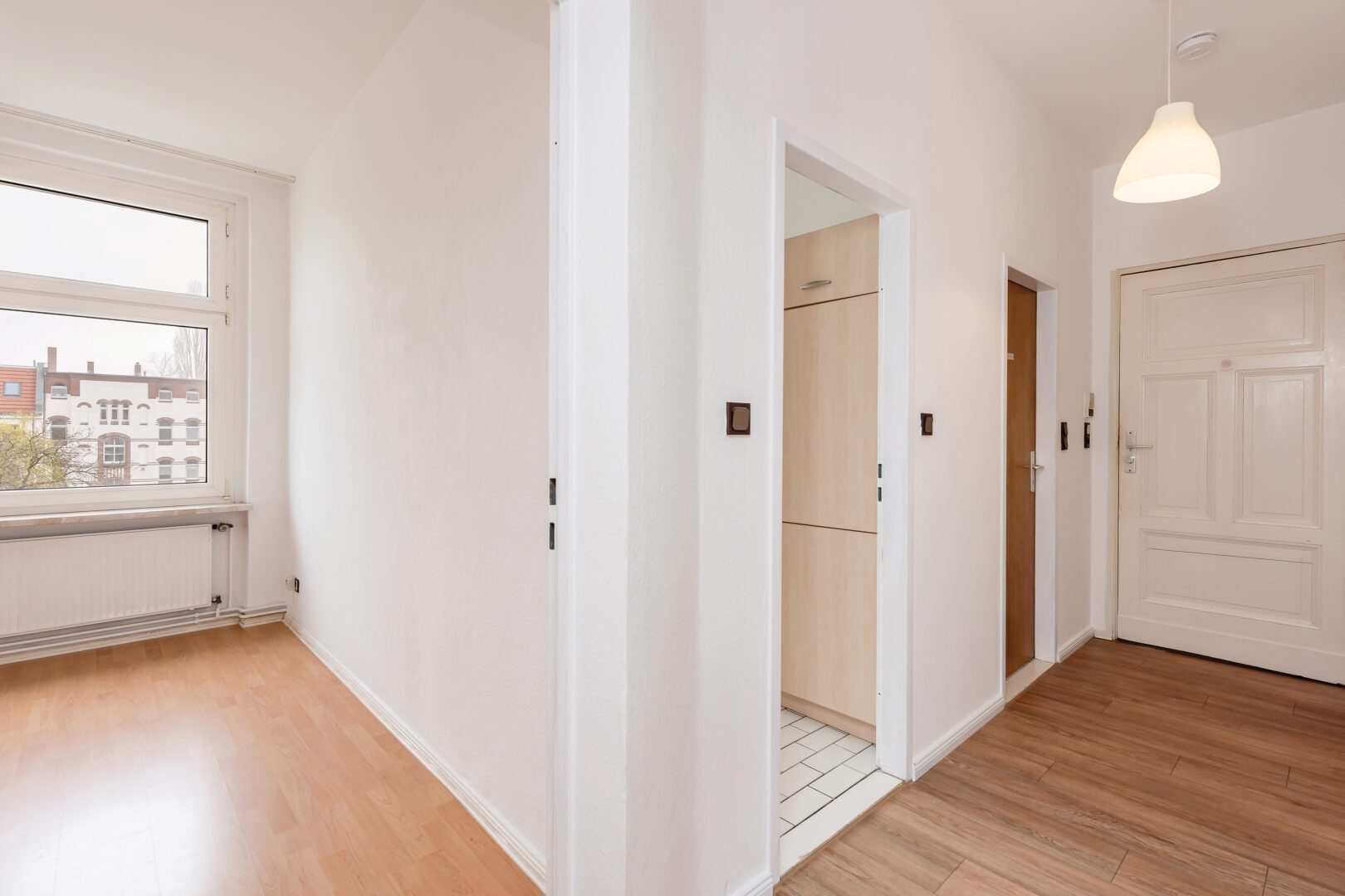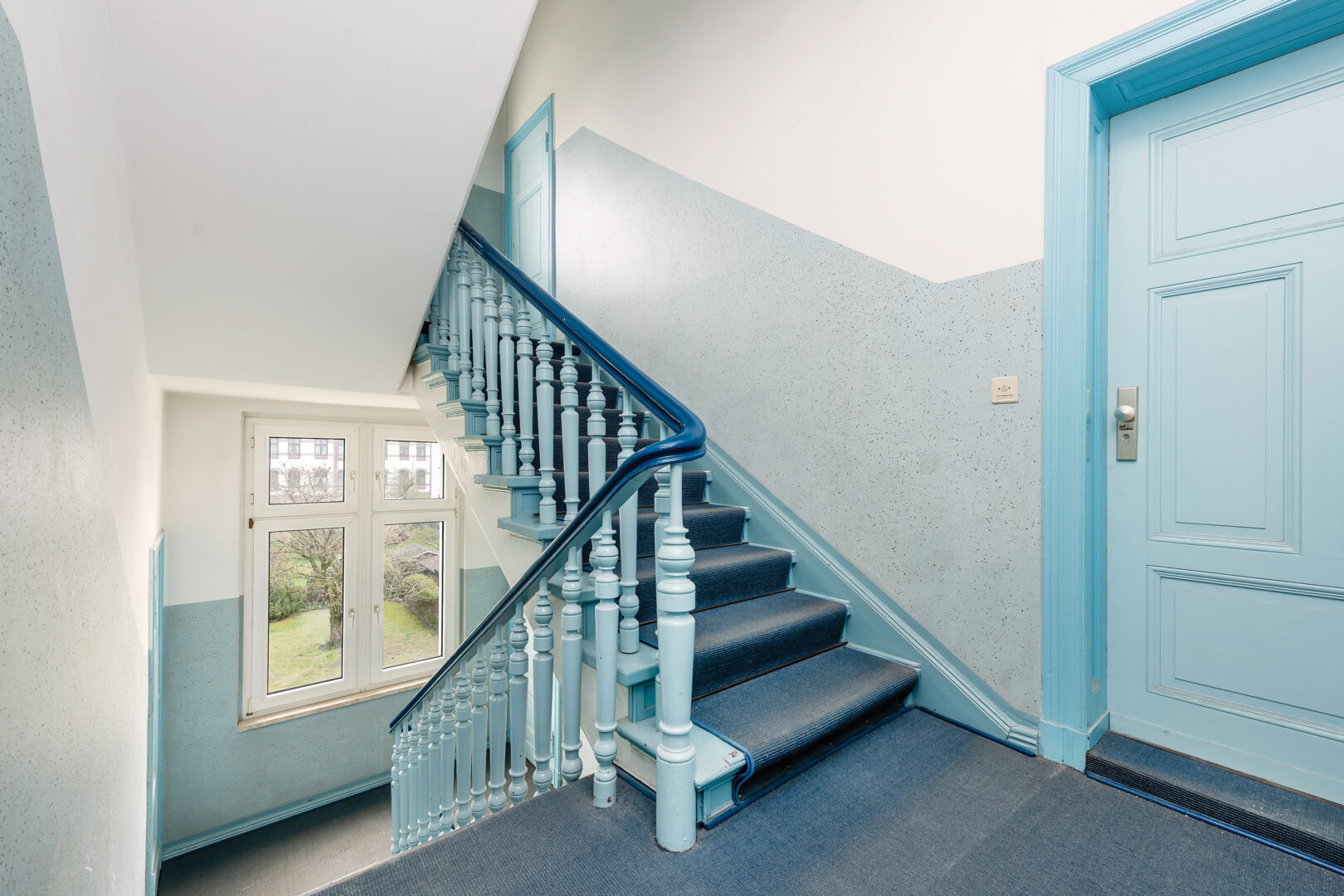 Die Wohnung befindet sich im 2. Obergeschoss eines gepflegten Mehrfamilienhauses aus dem Jahr 1900 und verbindet klassischen Altbaucharme mit praktischen Modernisierungen. Die Wohnräume sind mit Laminat ausgestattet, während Küche und Bad über pflegeleichte Fliesen verfügen. Alle Zimmer sind mit isolierverglasten Fenstern versehen.