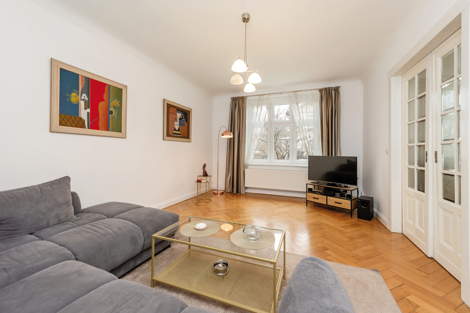 Der Zugang zum Haus erfolgt über einen hellen Vorflur mit Gartenblick. Eine original erhaltene Altbautür führt in das großzügige Entrée. Von hier aus sind sämtliche Räume des Erdgeschosses erschlossen. Diese Ebene umfasst ein tagesbelichtetes Gäste-WC, eine separate Küche mit Blick in den Garten und ein weitläufiges Wohn- und Esszimmer. Eine doppelseitige Schiebe-Kassettentür mit Schmuckgläsern aus den 1920er-Jahren verbindet den Wohn- mit dem Essbereich und unterstreicht den klassischen Charakter des Hauses.