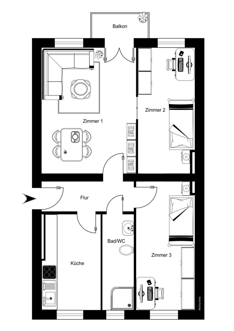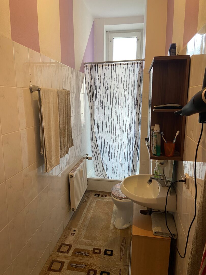 Die Wohnung liegt im Erdgeschoss und bietet auf ca. 61,92 m² Wohnfläche eine durchdachte Raumaufteilung mit hellen, gut geschnittenen Räumen. Vom zentralen Flur aus erreichen Sie die Küche, das Badezimmer sowie zwei der drei Zimmer direkt. Die Küche ist tagesbelichtet und bietet eine angenehme Atmosphäre. Das Badezimmer mit Fenster verfügt über eine Dusche und ist schmal und funktional geschnitten, wie es für Wohnungen aus dieser Bauzeit typisch ist.