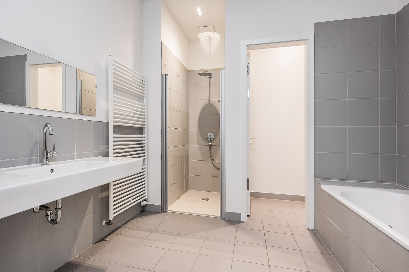 Zwei geräumige Schlafzimmer dienen als Rückzugsorte zur Entspannung. Dem Hauptschlafgemach ist ein großes, modern ausgestattetes Masterbad angeschlossen, das mit einer bodengleichen Dusche und Badewanne barrierefreien Komfort bietet. Ein separates Gäste-WC mit Dusche sowie ein Ankleidezimmer ergänzen das Raumangebot. Ein praktischer Hauswirtschaftsraum mit Waschmaschinenanschluss rundet das Angebot ab.