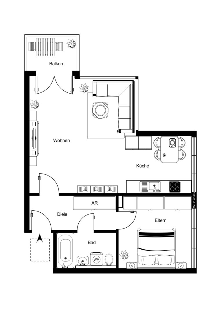 Herzstück der Wohnung ist der großzügige Wohnbereich mit offener Küche. Die voll ausgestattete Küche verfügt über einen integrierten Essbereich sowie bodentiefe Fenster. Vom Wohnbereich aus gelangen Sie auf den sonnigen Westbalkon.