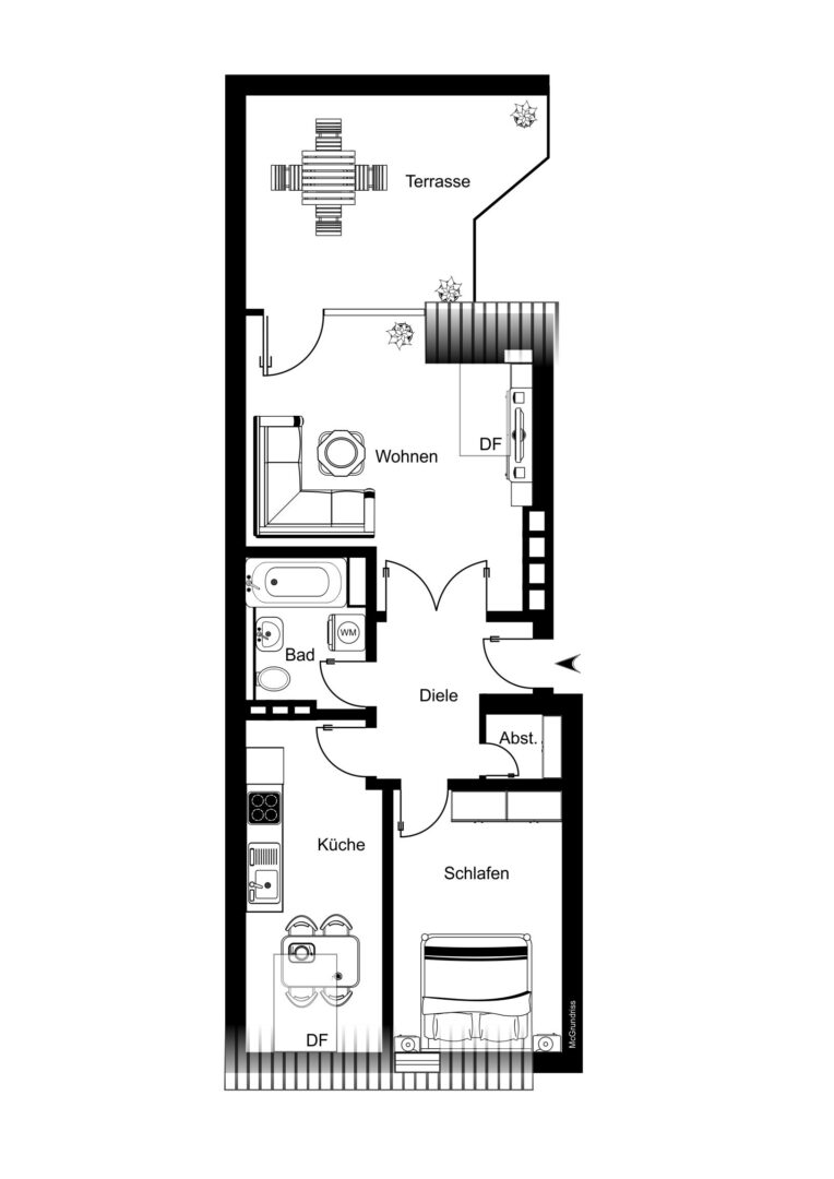 Beim Betreten dieser hellen, lichtdurchfluteten Wohnung wird Ihnen sofort bewußt: Im Mittelpunkt der Wohnung steht das helle Wohnzimmer mit Zugang zur großzügigen Dachterrasse. An den milden Abenden können Sie bei einem Glas Wein die herrlichen Sonnenuntergänge von Ihrer Terrasse erleben.